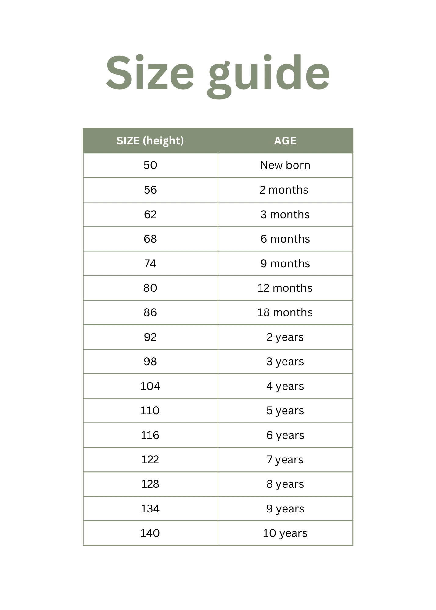 Verwenden Sie diesen Größenleitfaden als Orientierung, um die passende Größe für das jeweilige Alter zu ermitteln. Denken Sie daran, dass alle Kinder unterschiedlich sind, daher müssen Sie möglicherweise eine Größe größer oder kleiner wählen.